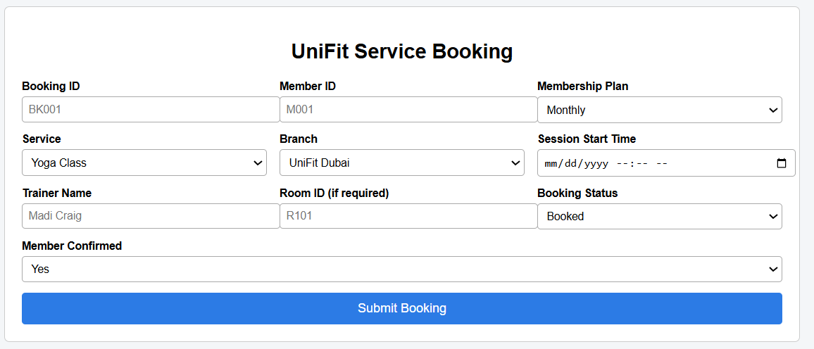 The management requires a database system to manage member registrations, service bookings, trainer schedules, room allocations, and attendance tracking. You conducted an interview with the operations manager and collected a sample booking record to identify key data requirements. The interview is shown in Figure 1. The sample service booking example customer is shown in Figure 2.Figure 2: Unifit service booking